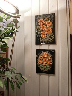 私が降りていくと、旦那が大きな陶板を手にしていました。それは・・・今まで見かけたことのないSwedenのJIEのかわいらしい陶板!!「うわ~~かわいいね♪」と言うと、何とおばさんの旦那さんが、壁にかかっているオレンジのお花の陶板たちか好きな方をプレゼントしてくれるっていうんです!
