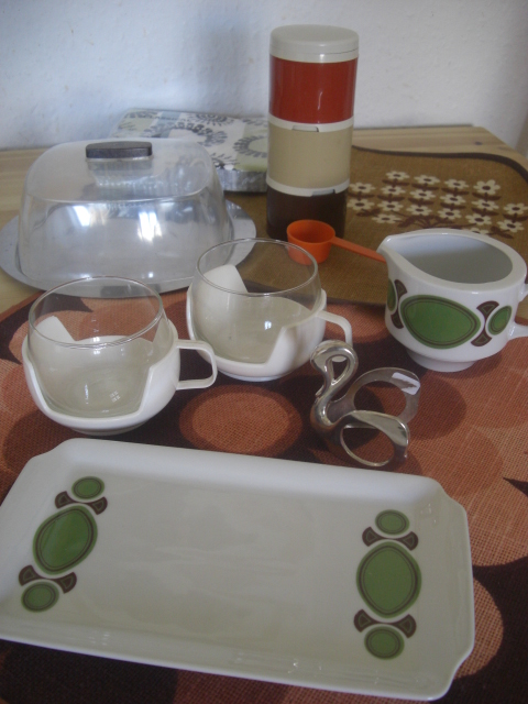 とっても70年代風なケーキやお菓子を入れておけるケースもステキ★持ち手が木で出来ていて、底はアルミだと思います。ケース自体はプラスチックです。