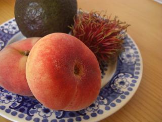 写真にも写っている、私の大好きなアラブのモモが!デンマークでは黄桃が主流なんですが、私は断然白い桃が大好き。こちらに来て2年ほどこのアラブの桃の存在を知らなかったんですが、コレを食べてからはもう毎年夏が待ちきれません!見かけは普通の桃をぎゅっと押しつぶして平たくした感じで、中身は白桃♪