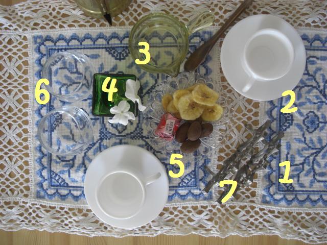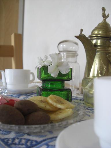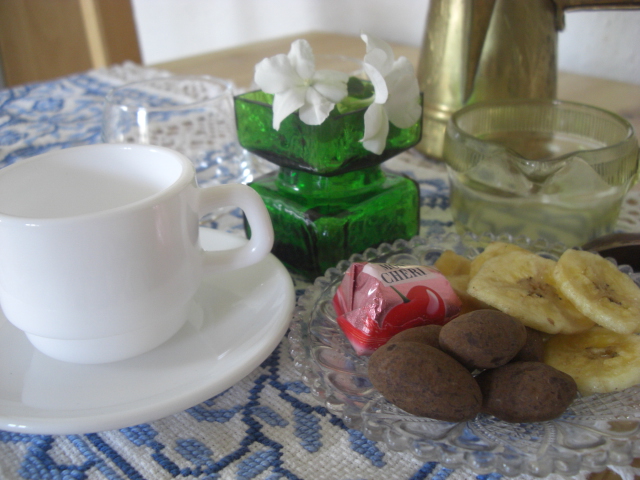 ランチョンマット代わりに、ハンドメイドの涼しげなテーブルセンターを使ってみました。家で愛用中のアラビアンコーヒーポットを添えて「パチリ」♪ あれ・・・?なんだかおフランス風ですかね?