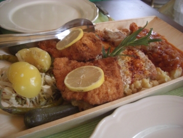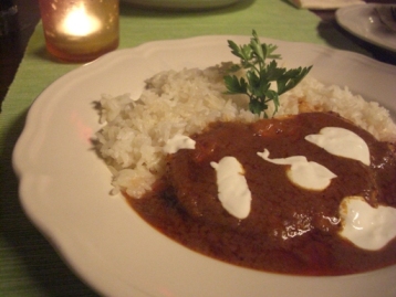 ソースでお料理したもの。ポテトやご飯、ハンガリーの伝統的なサラダまでついてきて、おなかいっぱい!!(あ、このハンガリーのサラダ。メニューにはサラダって書いてますが、実はピクルス・・・2人前頼んで、慌てました・・・こんなすっぱいの、山盛り2人分なんて無理無理・・・・ご旅行の際には気をつけてください!!)。