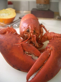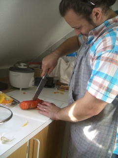 さて、解けてくれたのはいいんですが、よくテレビで見る「真ん中から真っ二つ」に切る、あの作業がどうしてもかわいそうでできなくて、旦那っちに登場してもらいました!いつも生きた魚もさばいてくれるので、お手の物!