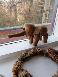 それも、大きい!おさるさんほどではないですが、やっぱり存在感たっぷり~!大きく鼻を振り上げて元気に窓枠に座っていました。その手前にあるリースとも雰囲気がぴったりあっていて、とっても素敵でした。